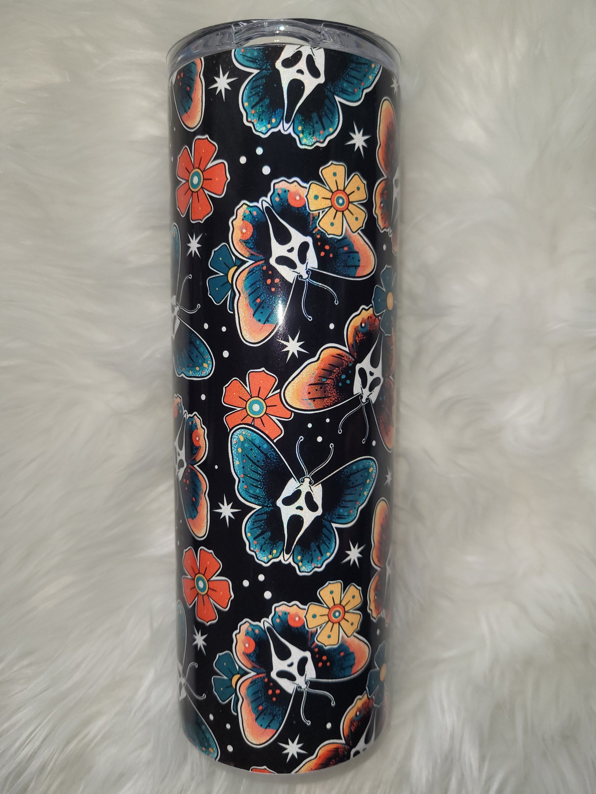 20oz Holographic tumbler with vibrant moth horror print! The shiny smooth finish really sparkles in the sunlight!