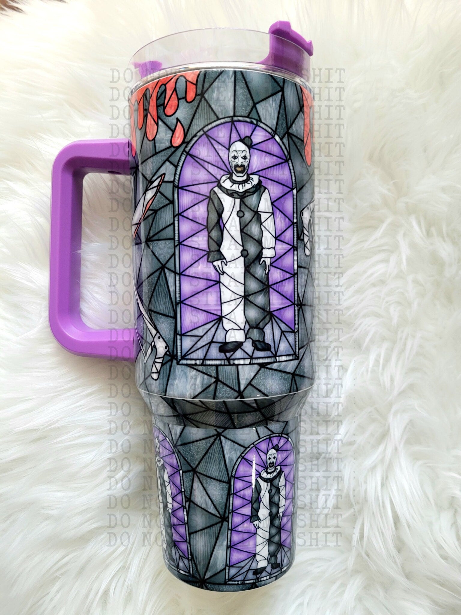 40oz Quencher Tumbler with amazing stained glass Horror character design. If you don't see your favorite character listed, ask me if I can make it!