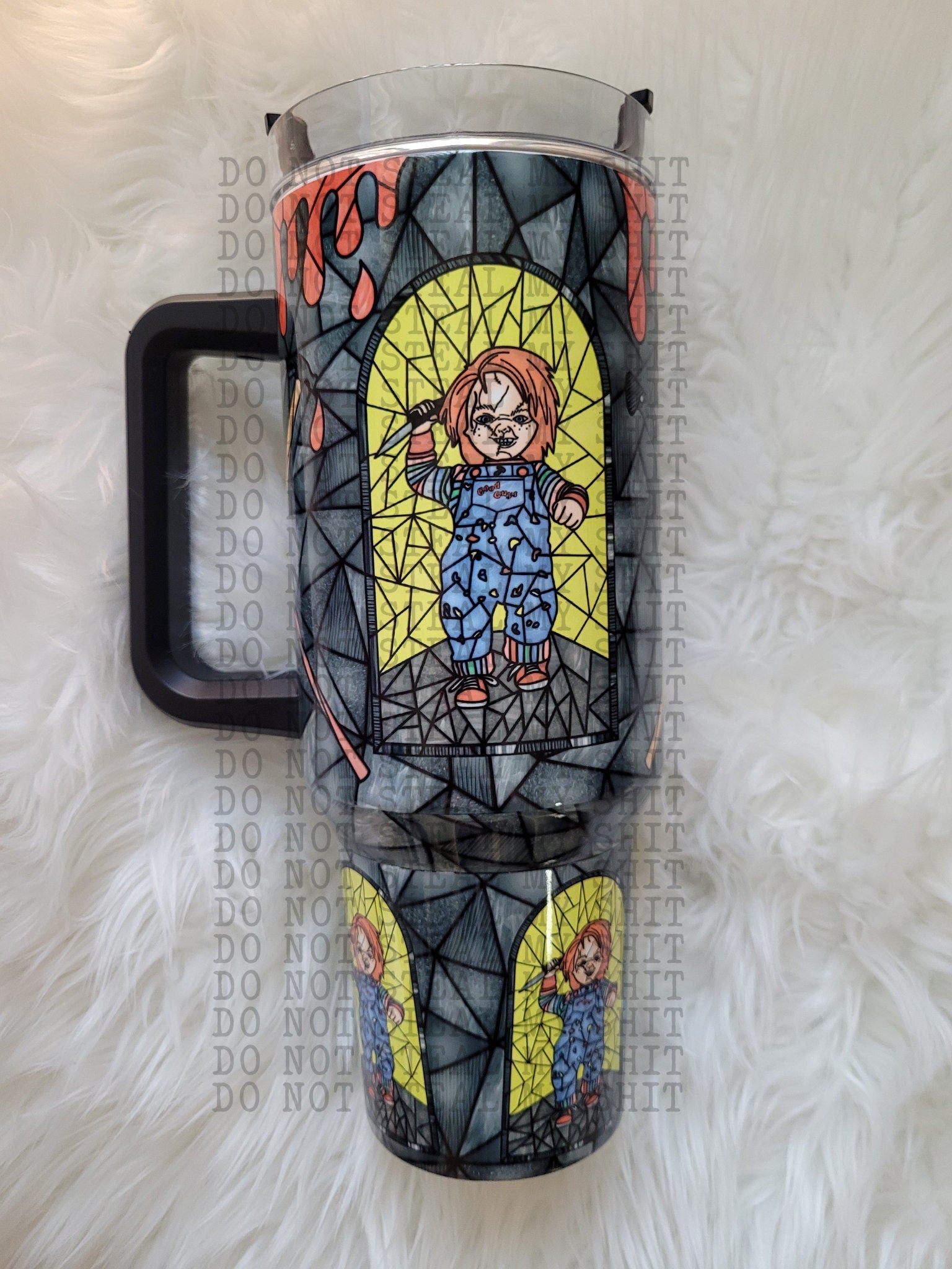 40oz Quencher Tumbler with amazing stained glass Horror character design. If you don't see your favorite character listed, ask me if I can make it!
