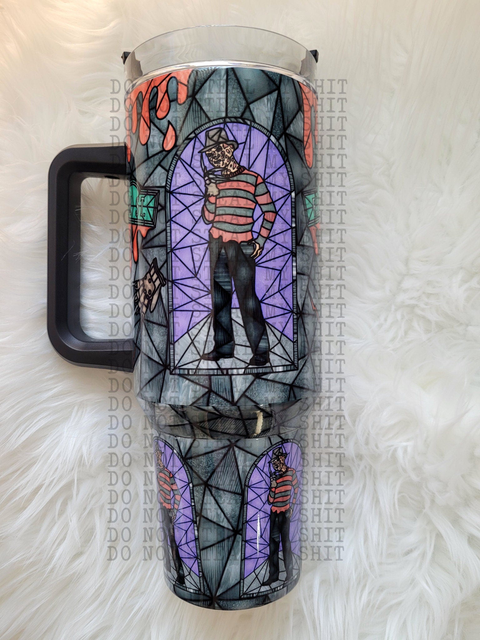 40oz Quencher Tumbler with amazing stained glass Horror character design. If you don't see your favorite character listed, ask me if I can make it!