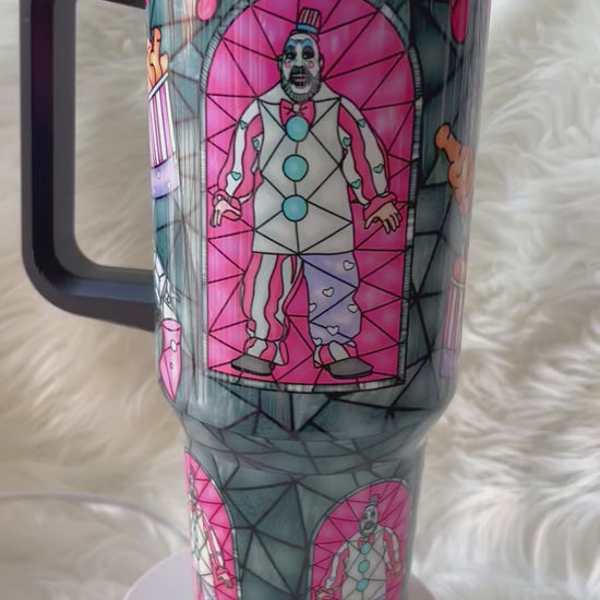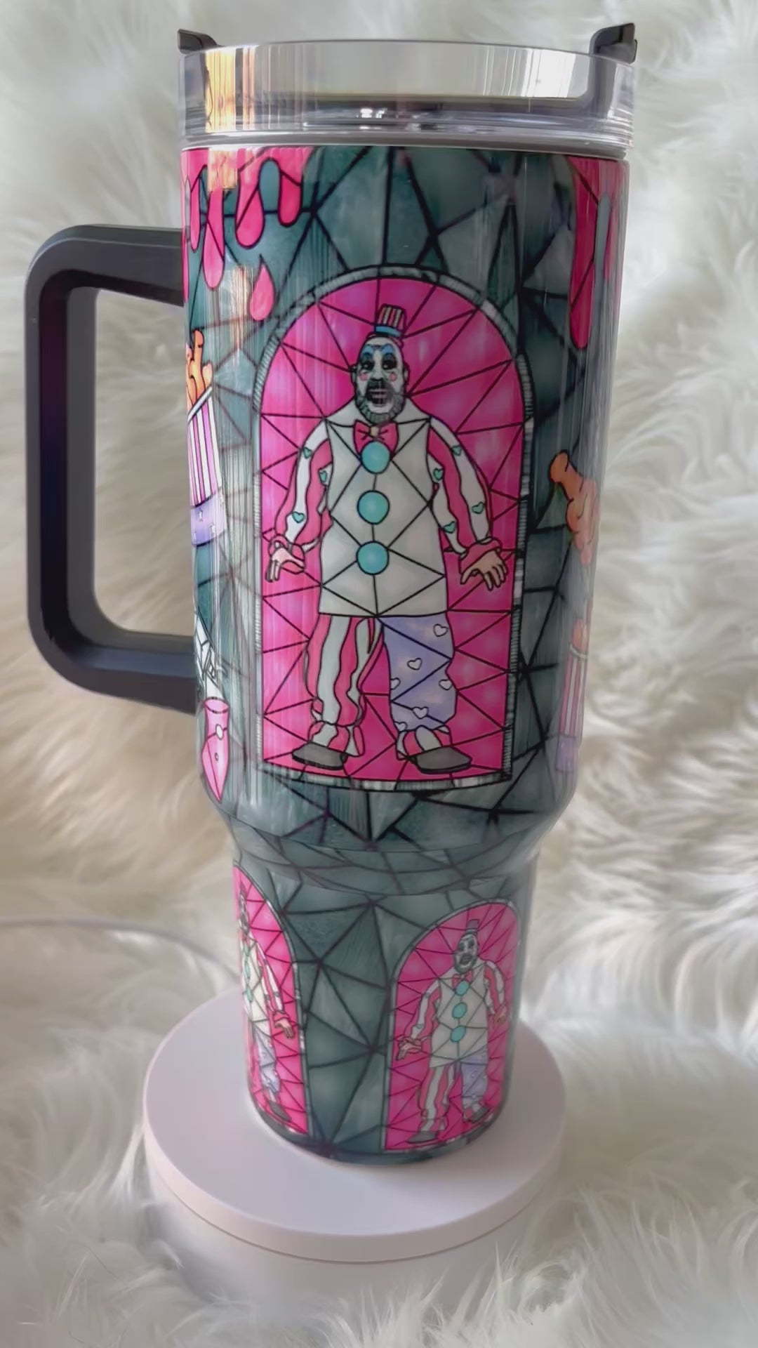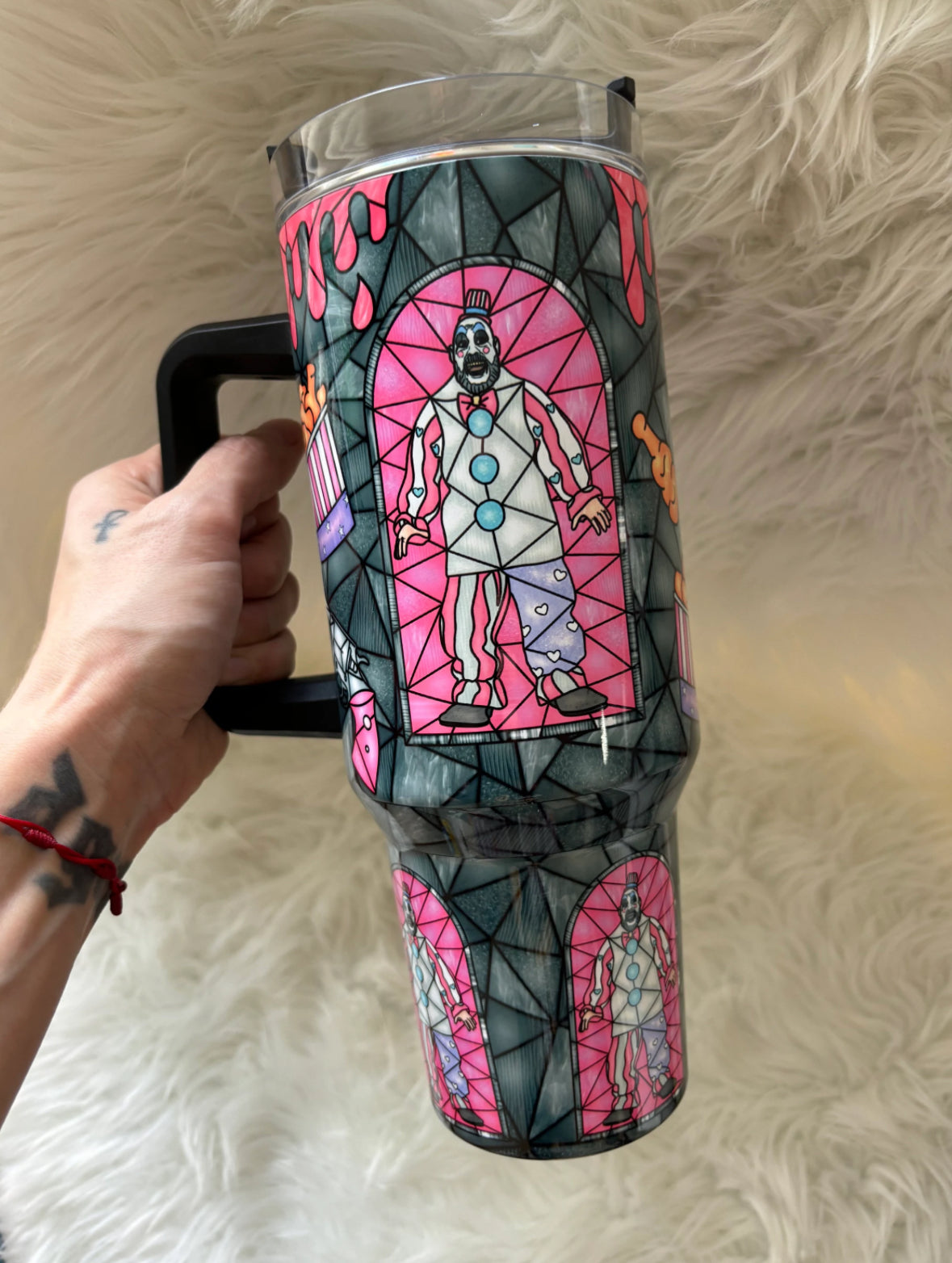 40oz Quencher Tumbler with amazing stained glass Horror character design. If you don't see your favorite character listed, ask me if I can make it!
