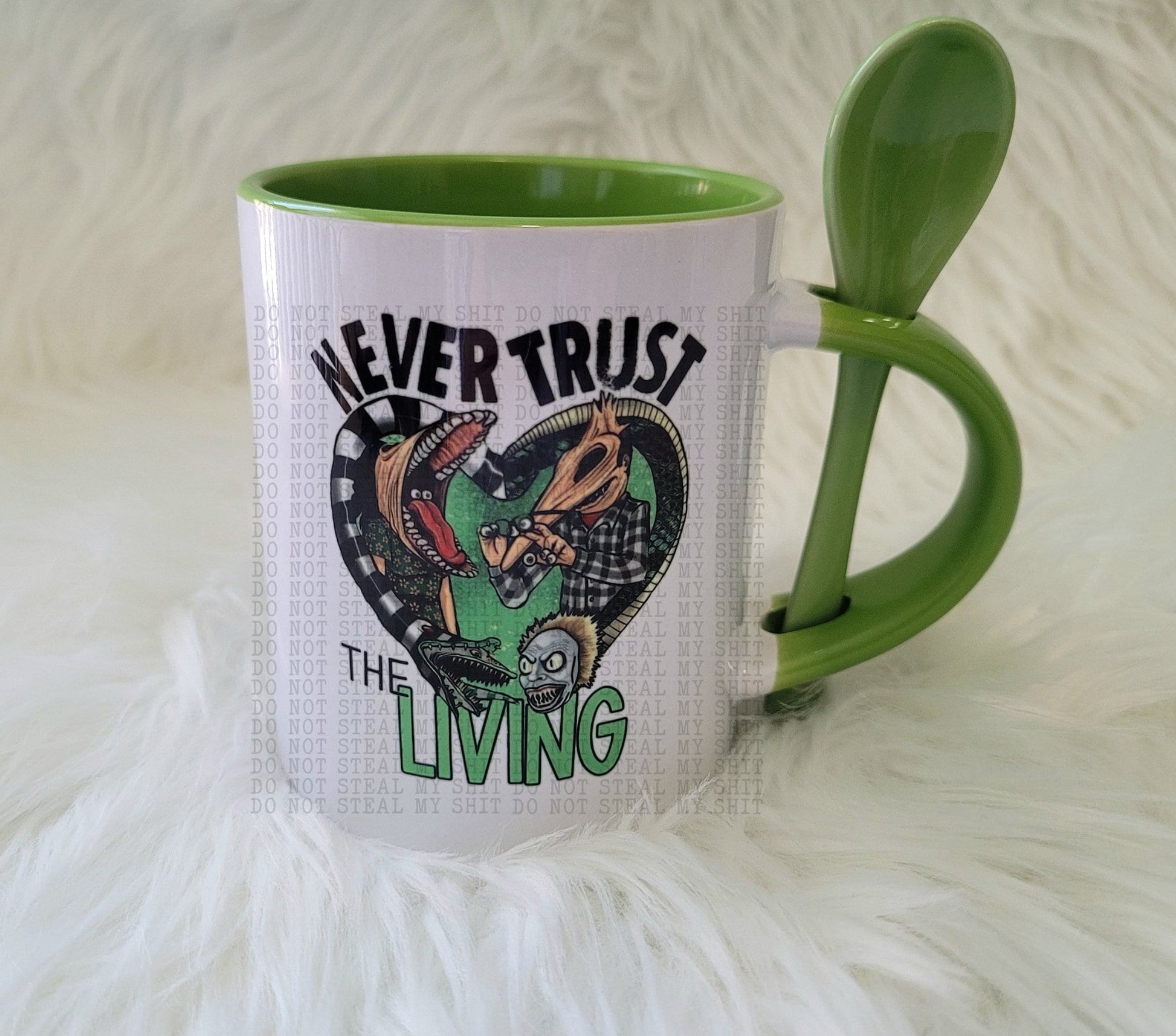 11oz Never Trust the Living Coffee Mug with matching colored spoon. Design is printed on both sides of the coffee mug, so you can see it no matter which hand you use to hold it.