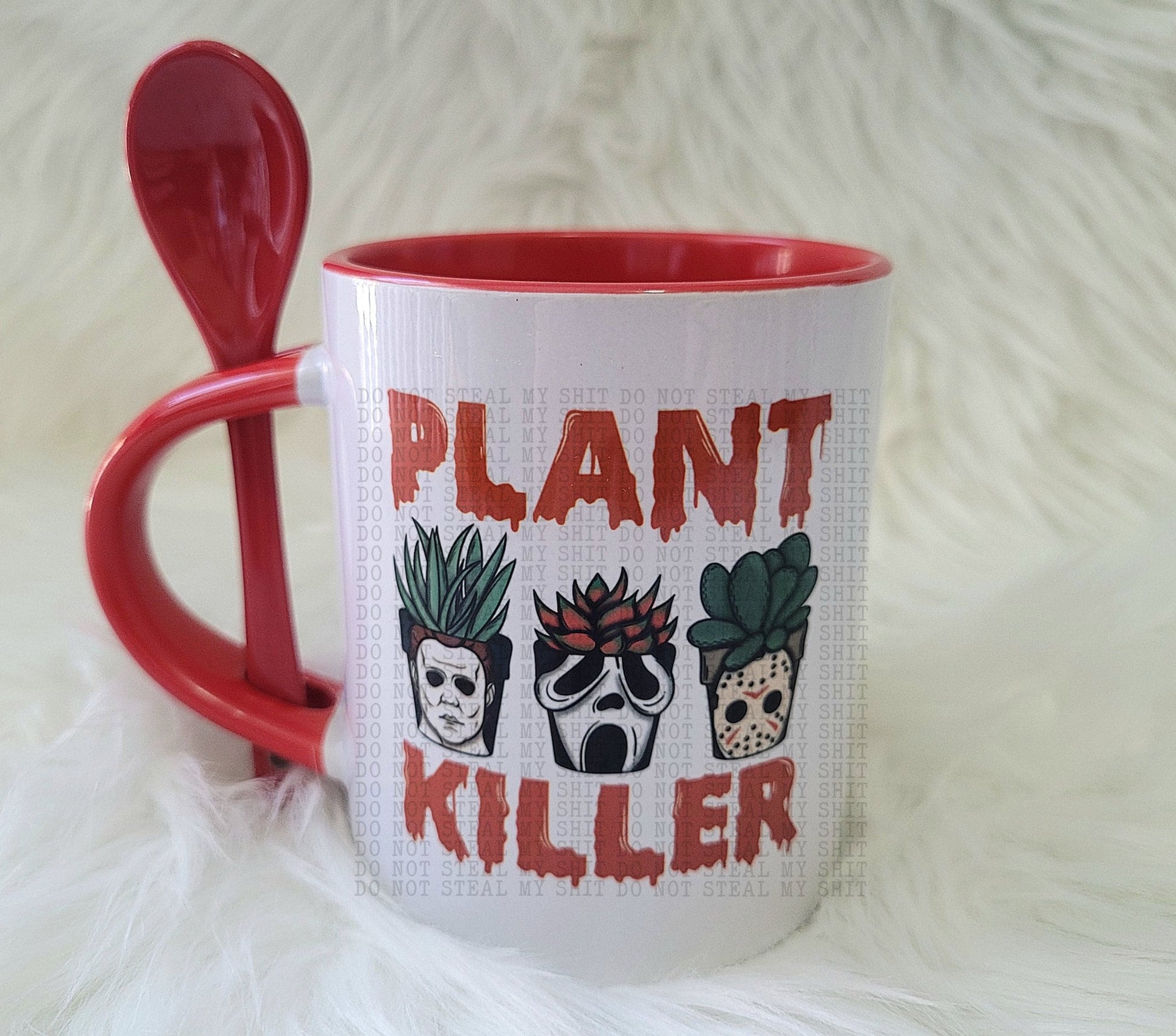 11oz Plant Killer Coffee Mug with matching colored spoon. Design is printed on both sides of the coffee mug, so you can see it no matter which hand you use to hold it.